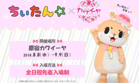 可愛いものとコラボカフェを展開する「原宿カワイーヤ」にて8月8日から暴走ゆるキャラでSNSやYouTubeで大人気「ちぃたん☆」× カワイーヤのコラボカフェ開催決定!ちぃたん☆のオリジナルメニューやグッズなど多数販売!利用・入場方法は全日程先着入場制、コラボレーション開催期間は2018年8月8日〜9月9日まで!
