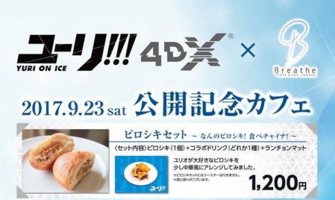 TVアニメ「ユーリ!!!on ICE 4DX」の公開を記念したカフェがユナイテッド・シネマ豊洲併設カフェ「Breathe(ブリース)」にて開催!オリジナルメニューとして、「ユーリ!!!on ICE 4DXカフェ」ではコースター付きドリンク、作中に登場するピロシキ(ランチョンマット付き)が販売されます!