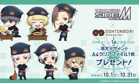 アイドルマスター(アイマス)シリーズの男性アイドルプロデュースゲーム「アイドルマスター SideM (エムマス)」× 道とん堀全国にて2021年10月1日〜10月31日までの期間限定で「サイドエム コラボ」開催!キャラクターをイメージしたオリジナルメニューや描き起こしイラストを使用した限定ノベルティーが登場!