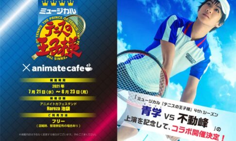 ジャンプSQ.(スクエア) に連載中「許斐剛」先生による大人気漫画を原作とした「ミュージカル テニスの王子様 4thシーズン 青学vs不動峰」の上演を記念し、アニメイトカフェスタンドHareza池袋にて2021年7月21日~8月23日までの期間限定でコラボカフェ開催! コラボメニューやグッズの販売を実施!