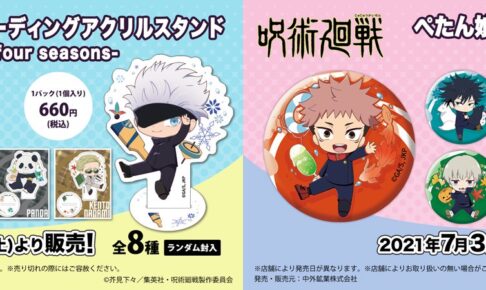 芥見下々先生による人気漫画を原作としたTVアニメ「呪術廻戦」の描き起こしミニキャライラスト「ぺたん娘」の新作グッズが、全国セブンイレブンにて2021年7月3日より新発売!虎杖悠仁・伏黒恵・釘崎野薔薇・禪院真希・狗巻棘・パンダ・七海建人・五条悟らのアクリルスタンド・缶バッジ・ルームキーホルダーがラインナップ!