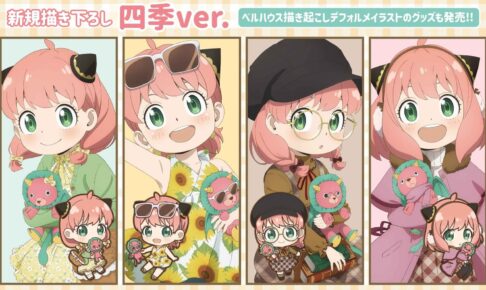 遠藤達哉先生による人気漫画を原作としたテレビアニメ「SPY×FAMILY (スパイファミリー)」から、 メガネを掛けた文学少女風姿やピクニック姿など、アーニャとキメラさんが春夏秋冬、おしゃれな衣装でコーディネートした新規描き下ろしイラスト”四季 Ver. ”を使用したグッズが、2023年1月に発売される。