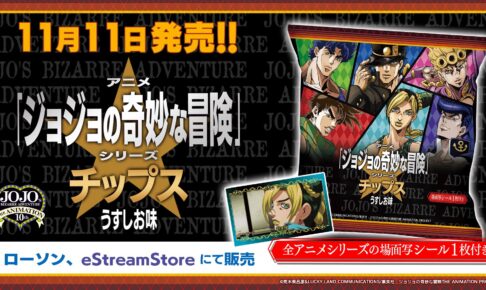 荒木飛呂彦先生による大人気漫画を原作とするTVアニメ「ジョジョの奇妙な冒険」× メディコス・エンタテインメントによる、アニメ「ジョジョの奇妙な冒険」10周年を記念した『ジョジョチップス』が、2022年11月11日より全国のローソン・eStreamStore・MEDCOS SHOPなどにて発売される。